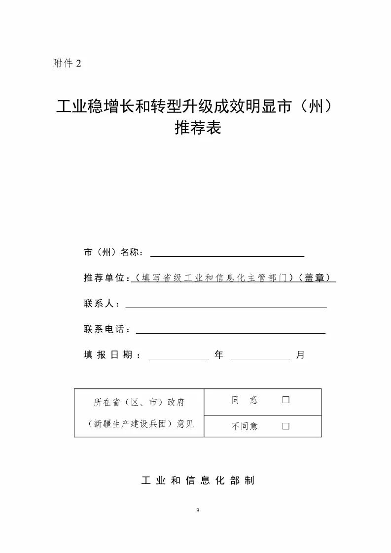 三、各地评选推荐结果报经省级政府同意后,请于2018年2月24日前将申报材料(含工业稳增长和转型升级成效明显市(州)申报书、推荐表,一式三份,附电子版光盘)报工业和信息化部(规划司)。